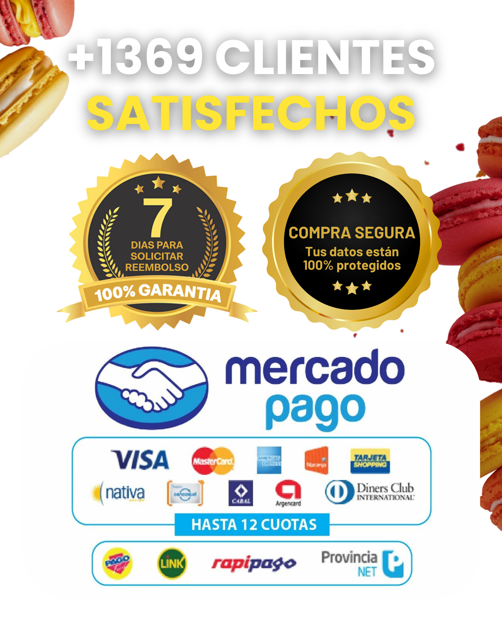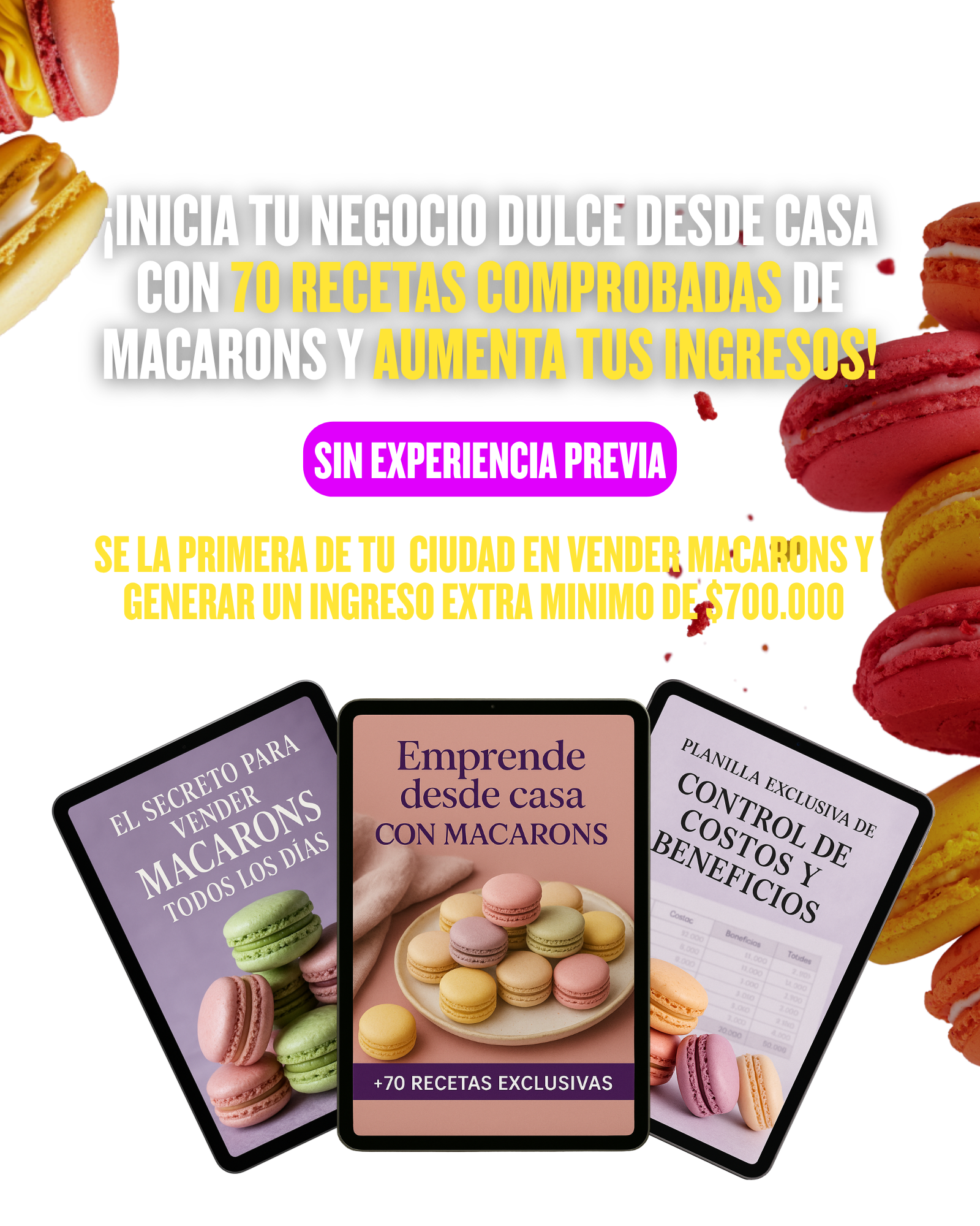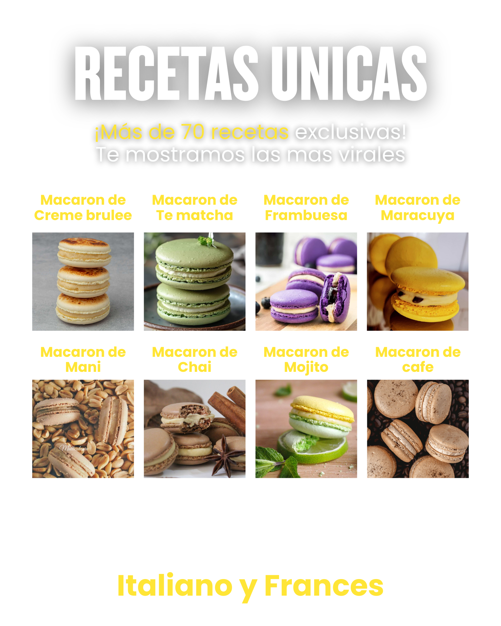 ¡Sí! El ebook trae más de 70 recetas exclusivas, con variaciones de sabores, rellenos y colores para que puedas crear macarons únicos, personalizados y listos para sorprender en cualquier ocasión.